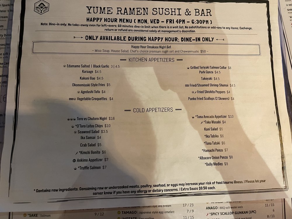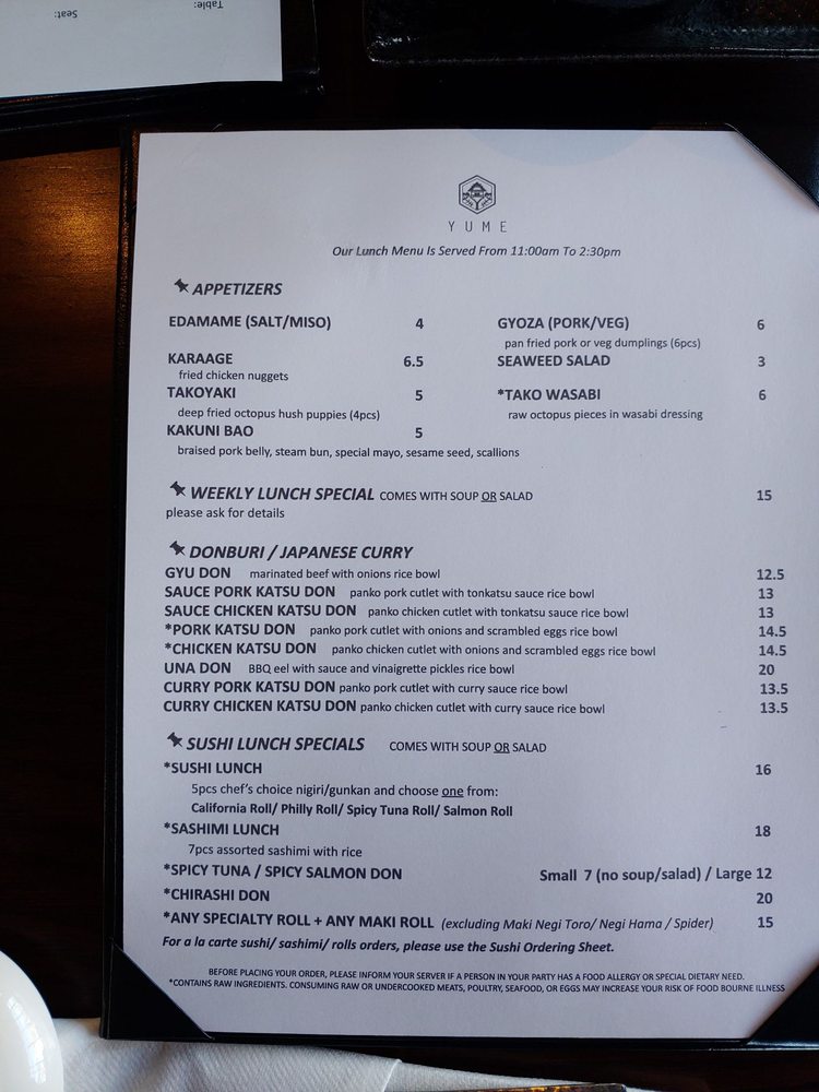 Any YUME Signature Roll of up to $15 value + One Maki roll of up to $8 value. Or just add the difference if you choose any Signature roll that is above.