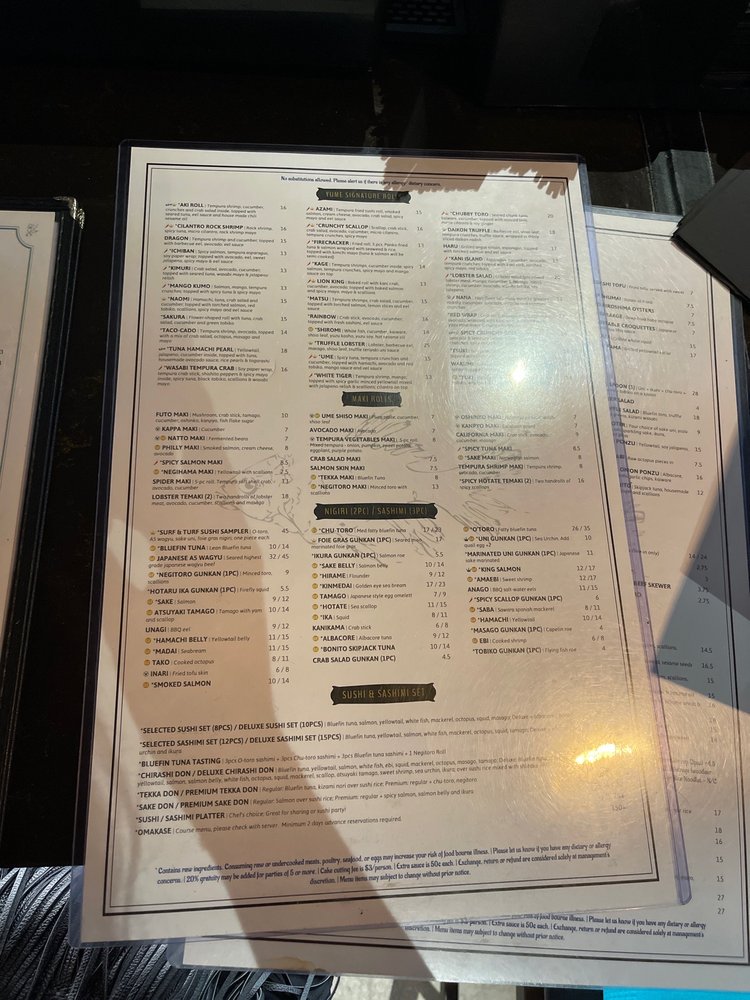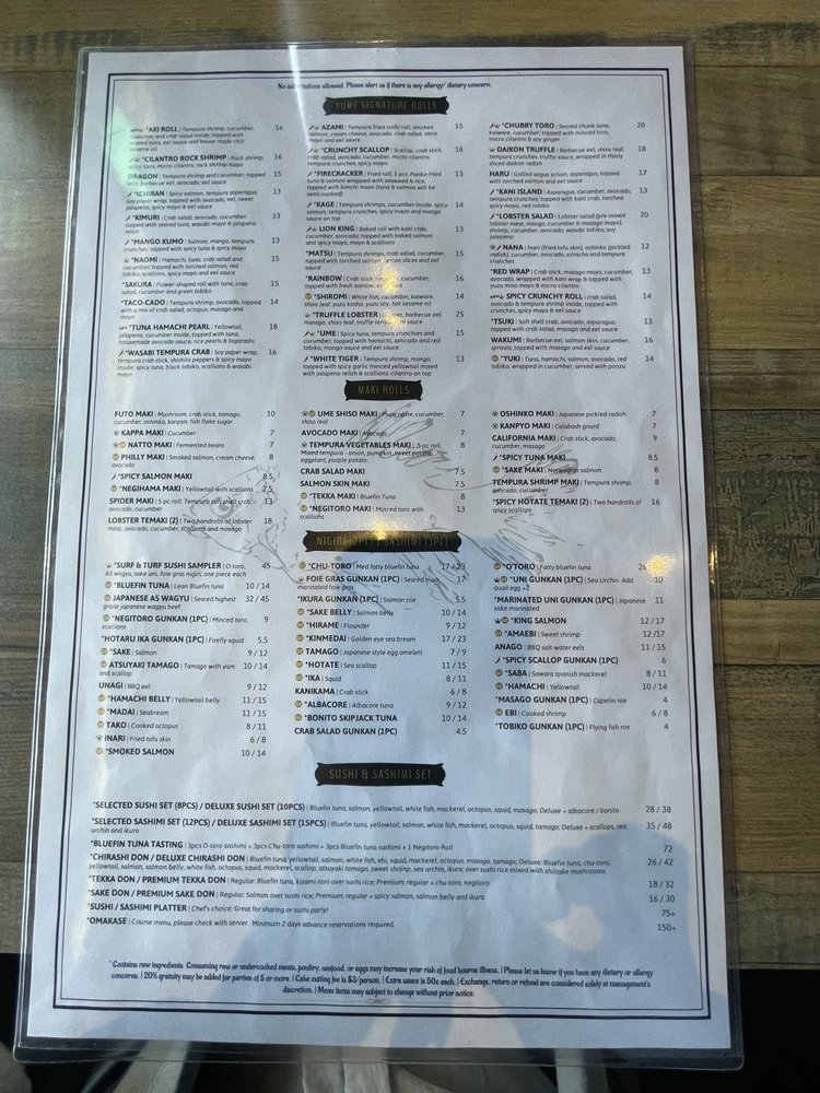 Bluefin tuna, salmon, yellowtail, white fish, mackerel, octopus, squid, masago. Ingredients may be substituted with similar value item due to availability without prior notice.